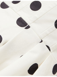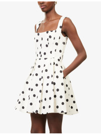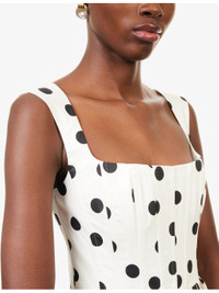 PRODUCT DETAILS - Rebecca Vallance cotton-blend mini dress - 97% cotton, 3% elastane; contrast 97% cotton, 3% elastane; lining 100% cotton - Concealed zip fastening at back - Regular fit, square neck, wide shoulder straps, corset bodice, two side seam pockets, flared skirt, all-over polka-dot pattern, mini length, fully lined - Dry clean - True to size - Size UK 8: length 33in / 84cm - Model is 5ft 10in/1.78m and wears a size UK 8 - Midweight, non-stretch Ref: R04552313