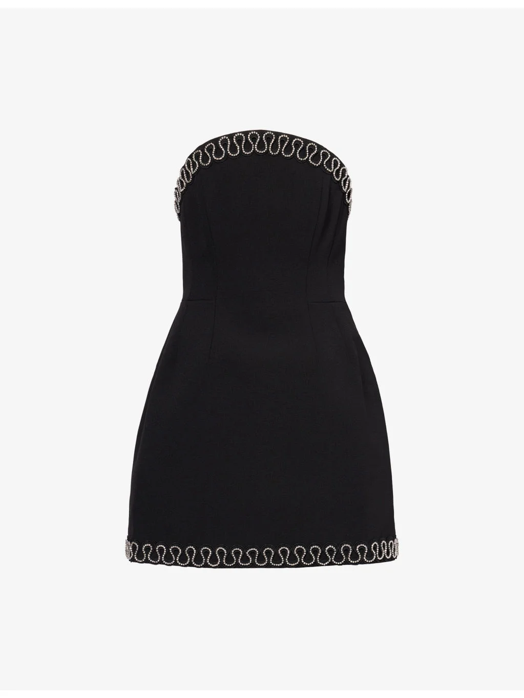 PRODUCT DETAILS - Rebecca Vallance bonded-crepe mini dress - 97% polyester, 3% elastane; lining 97% polyester, 3% elastane - Concealed zip fastening at back - Slim fit, strapless, curved neckline, interior boning, diamante-embellishments at front and back, tulip silhouette, mini length, fully lined - Dry clean only - True to size - Size UK 8: length 27in / 68.5cm - Model is 5ft10in/1.78m and wears a size UK 8 - Midweight, non-stretch Ref: R04552315