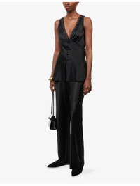 PRODUCT DETAILS - Reformation silk top - 100% silk; lining 100% viscose - Exposed button fastenings at front - Slim fit, V-neckline, sleeveless, button front, lace trims, V-back, adjustable tie at back, silk finish - Dry clean - True to size - Model is 5ft 10in/1.78m and wears a size UK 8 - Lightweight, non-stretch Ref: R04546886