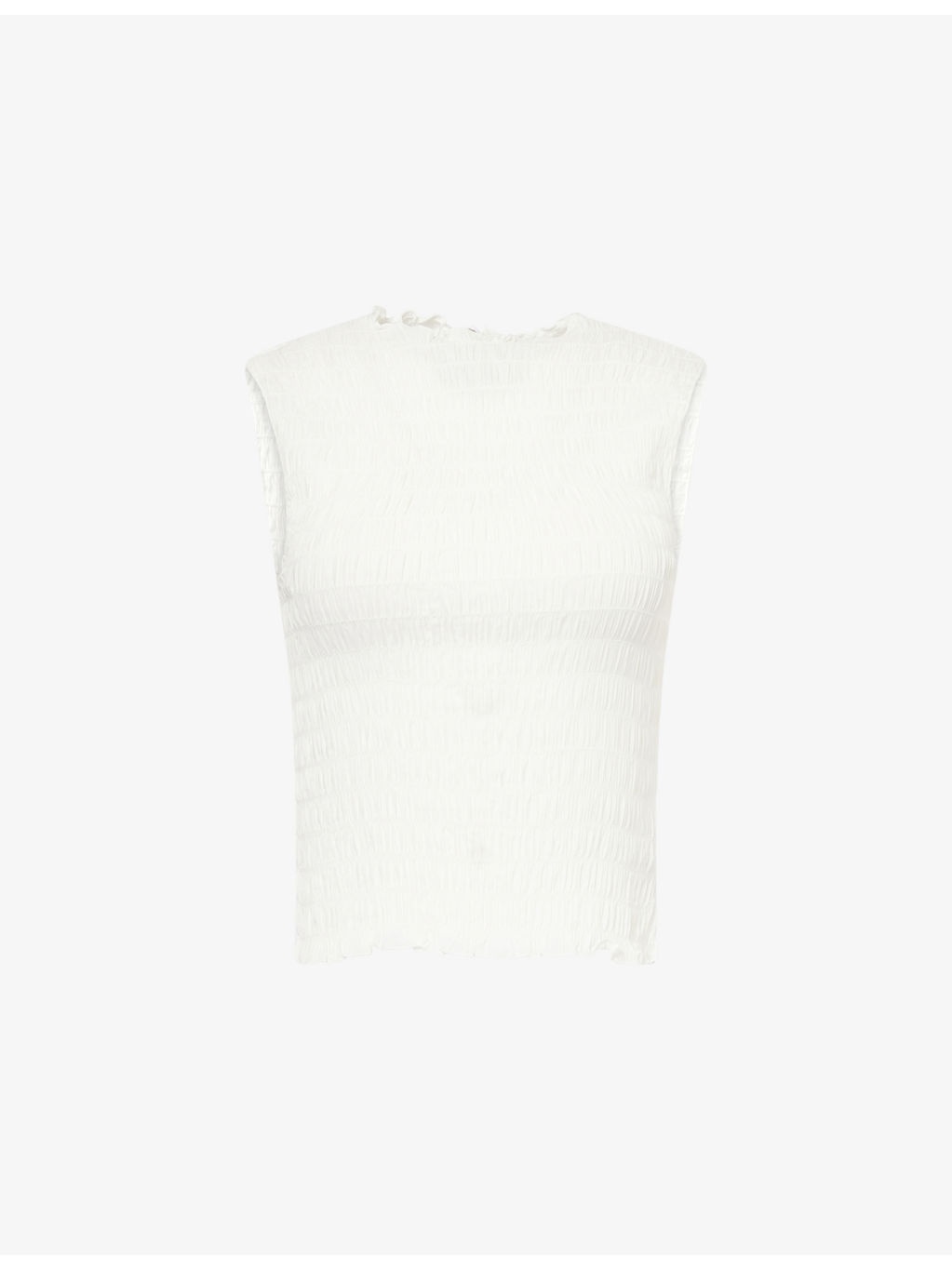 PRODUCT DETAILS - Reformation stretch-woven top - 53% viscose, 47% cotton - Exposed button fastening at back - Regular fit, round neck with frilled trim, sleeveless, all-over shirring - Machine wash mild - True to size - Model is 5ft 10in/1.78m and wears a size small - Lightweight, stretchy Ref: R04477878