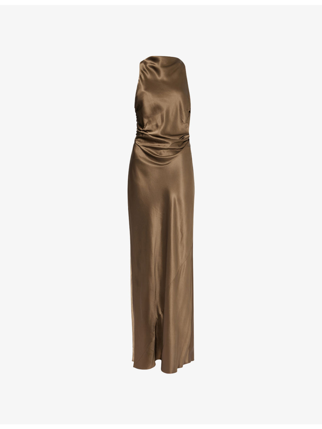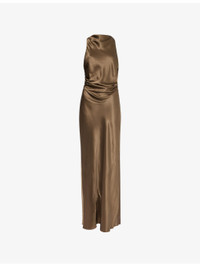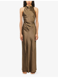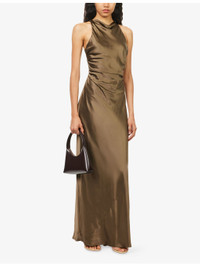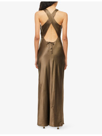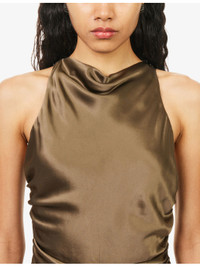 PRODUCT DETAILS - Reformation silk midi dress - 100% silk; lining 100% polyester - Self-tie fastening at back - Slim fit, cowl-neck, sleeveless, criss-cross straps and cut-out at back, ruched, all-over satin texture, fully lined - Dry clean - True to size - Size UK 8: length 62in / 157cm - Model is 5ft 10in/1.78m and wears a size UK 8 - Lightweight, slight stretch Ref: R04535173