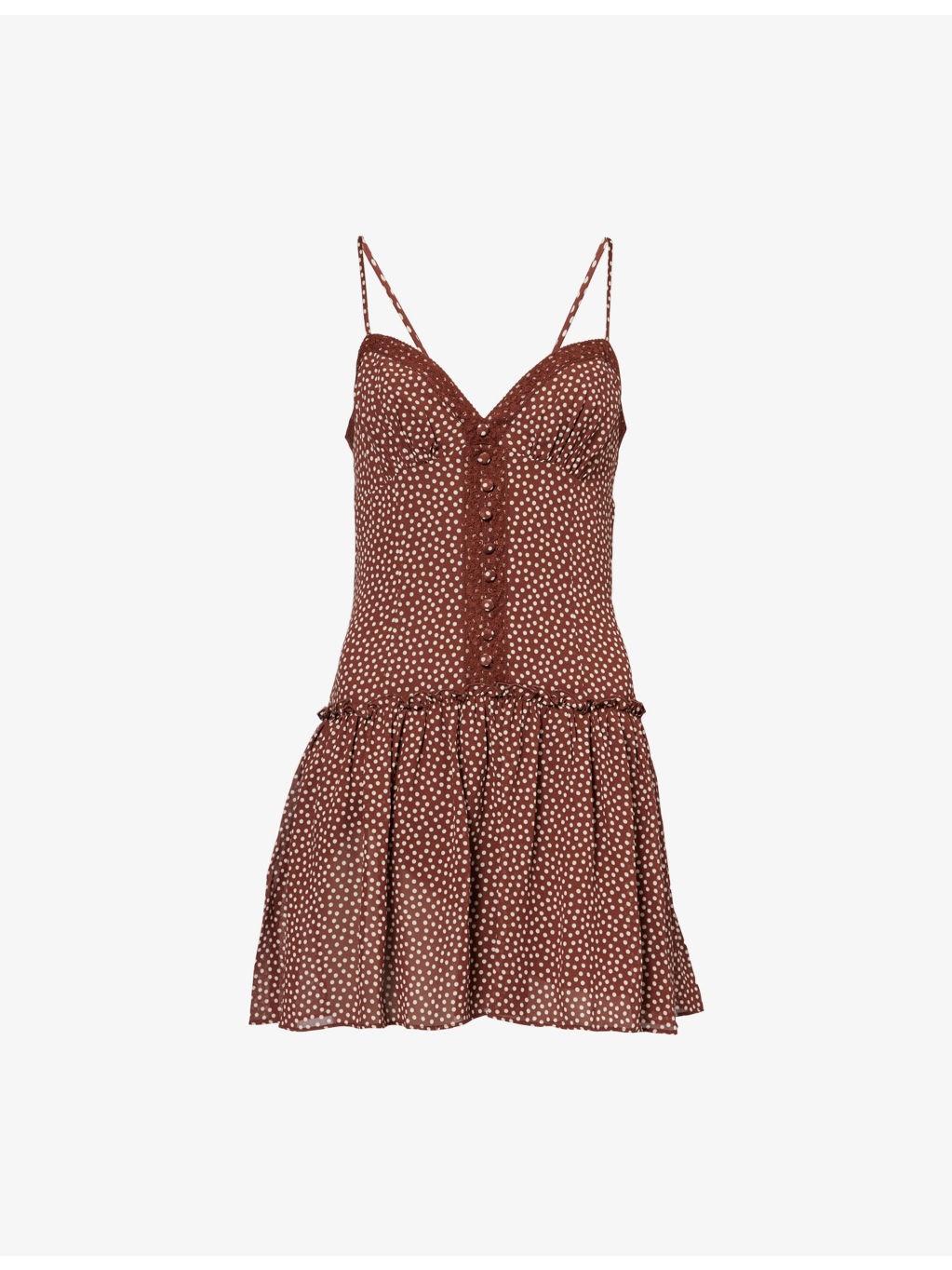 PRODUCT DETAILS - Reformation woven mini dress - 100% viscose; lining 100% viscose - Concealed zip fastening - Regular fit, plunge V-neckline, sleeveless, adjustable straps, lace trim, polka dot pattern, soft flared hem - Machine wash cold - True to size - Size UK 8: length 30in / 76cm - Model is 5ft 10in/1.78m and wears a size UK 8 - Lightweight, non-stretch Ref: R04459955