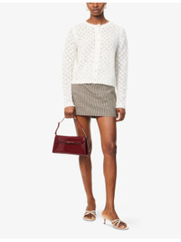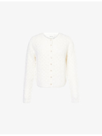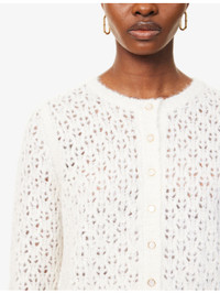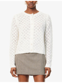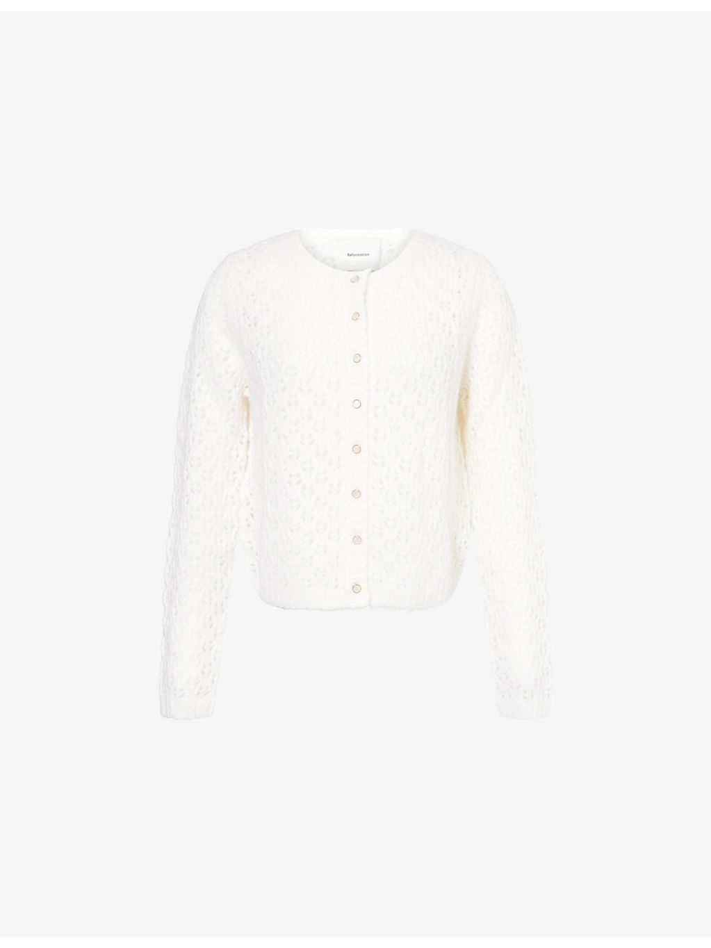 PRODUCT DETAILS - Reformation alpaca wool-blend cardigan - 56% alpaca, 32% wool, 12% nylon - Button fastening at front - Relaxed-fit, round-neck, long-sleeves, gold colour button edges, all-over crochet texture, semi-sheer, ribbed trims - Dry clean only - True to size - Model is 5ft 10in/1.78m and wears a size small - Lightweight, non-stretch Ref: R04459370