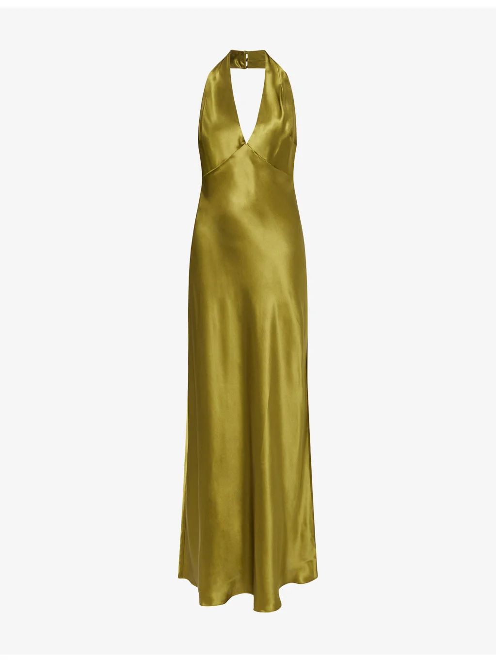 PRODUCT DETAILS - Reformation silk maxi dress - 100% silk - Concealed zip fastening at back - Slim fit, deep V-neck, buttoned halterneck, bust seams, open back, ankle length - Dry clean - True to size - Size UK 8: length 63in / 160cm - Model is 5ft 10in/1.78m and wears a size UK 8 - Lightweight, non-stretch Ref: R04598620
