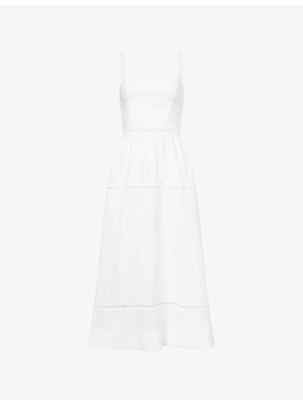 PRODUCT DETAILS - Reformation linen midi dress - 100% linen - Concealed zip fastening at back - Regular fit, square neck, sleeveless, fitted bodice with smocking at back, ladder embroidery, gathered waist, tiered - Machine wash at 30°C - True to size - Size UK 4: length 46.5in / 118cm - Model is 5ft 10in/1.78m and wears a size UK 4 - Midweight, non-stretch Ref: R04477874
