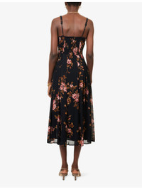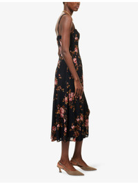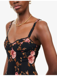 PRODUCT DETAILS - Reformation woven midi dress - 100% viscose; lining 100% viscose - Concealed zip fastening at side - Regular fit, sweetheart neckline, ruffled adjustable shoulder straps, elasticated shirred back, side slit, all-over floral print, midi length, lined - Dry clean - True to size - Size UK 8: length 48in / 122cm - Model is 5ft 10in/1.78m and wears a size UK 8 - Lightweight, non-stretch Ref: R04546882
