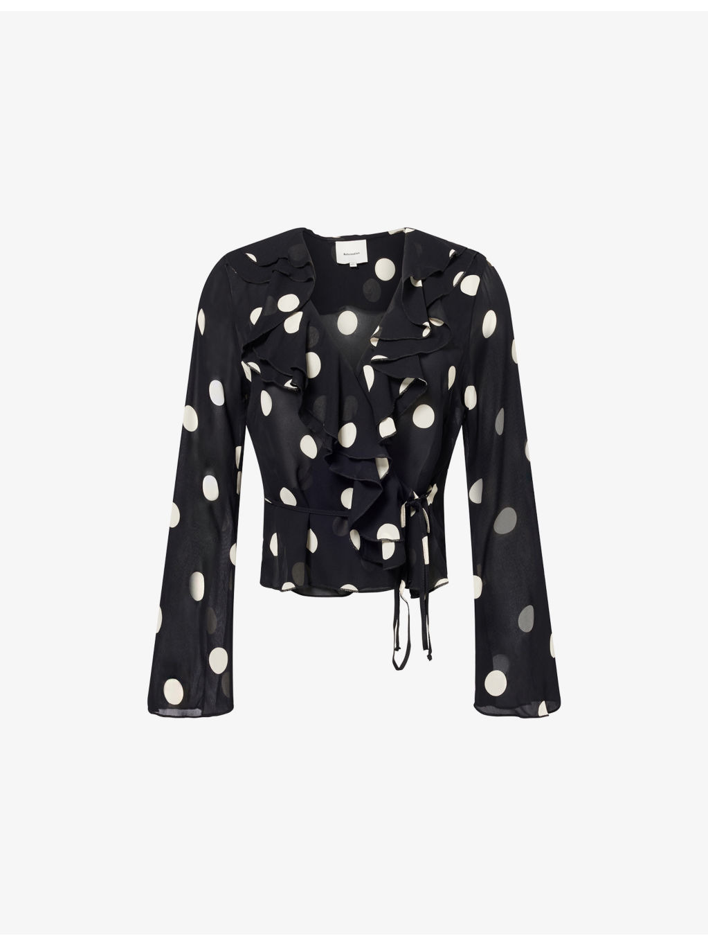 PRODUCT DETAILS - Reformation crepe top - 100% viscose - Concealed hook-and-eye and self-tie fastenings at front - Regular fit, V-neck, ruffled collar, long sleeves, wrap design, all-over polka dot pattern - Dry clean - Made in Mexico - True to size - Size UK 8: length 22in / 56cm - Model is 5ft 10in/1.78m and wears a size UK 8 - Lightweight, non-stretch Ref: R04522332