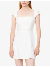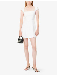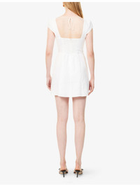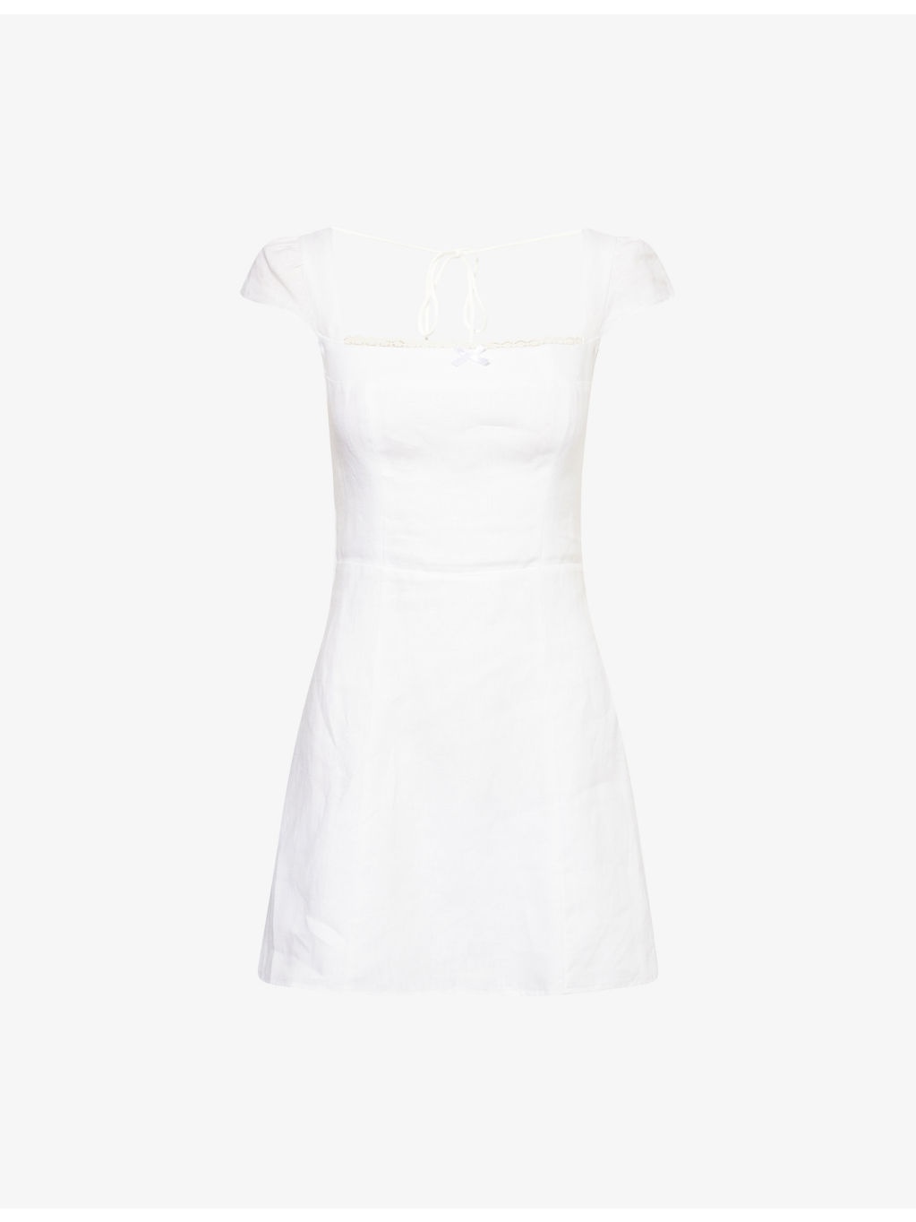PRODUCT DETAILS - Reformation linen mini dress - 100% linen; lining 100% rayon - Concealed zip fastening at back - Regular fit, embroidered square neck, cap sleeves, satin bow embellishment at front, shirred panel at back, fully lined, flared hem - Machine wash at 30°C - True to size - Size UK 8: length 31in / 79cm - Model is 5ft 10in/1.78m and wears a size UK 8 - Lightweight, slight stretch Ref: R04459954