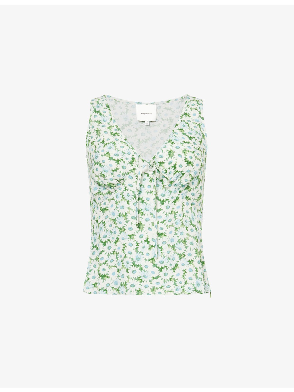PRODUCT DETAILS - Reformation crepe top - 53% viscose, 47% rayon - Concealed zip fastening at side - Slim fit, V-neck, keyhole cut-out at chest, gathered cups, all-over floral print - Hand wash - True to size - Model is 5ft 10in/1.78m and wears a size UK 6 - Lightweight, non-stretch Ref: R04477886