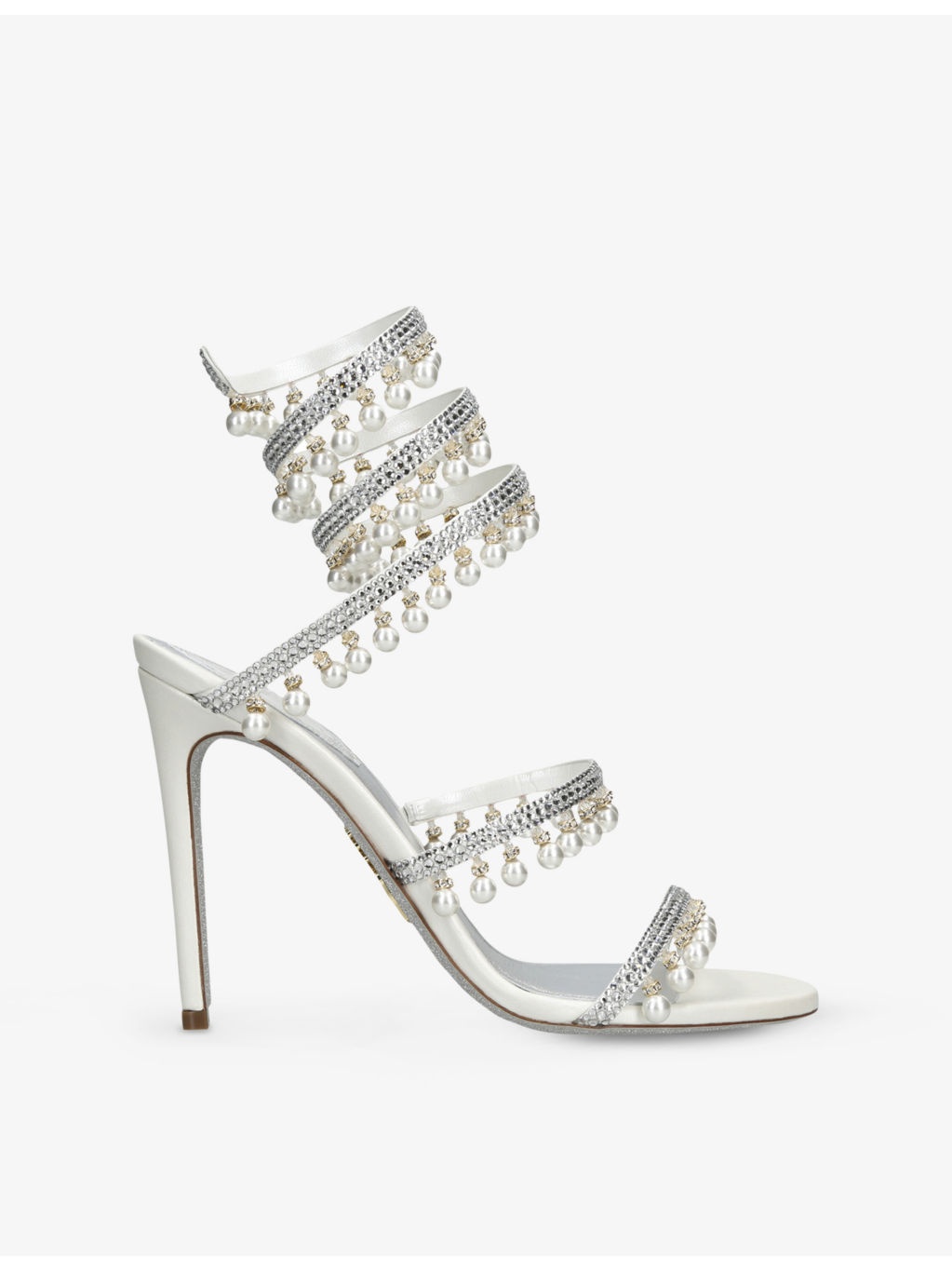 PRODUCT DETAILS - Rene Caovilla leather heeled sandals - 100% leather - Round open toe, hand-applied rhinestones and pearl embellishments, high stiletto heel, spiral coiling going up the ankle, branded insole, stardust sole, metallic finish - Heel height 105mm / 4.13in - Specialist leather clean - Made in Italy - Upper: 100% leather - Lining: 100% leather - Sole: 100% leather Ref: R04448698