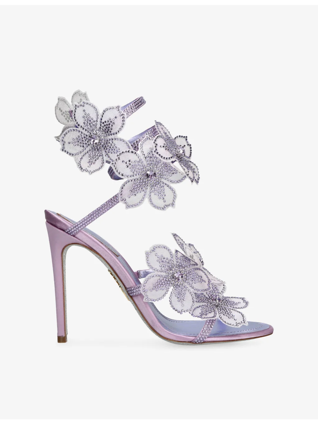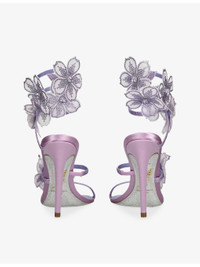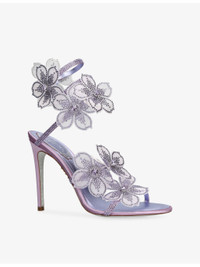PRODUCT DETAILS - Rene Caovilla satin heeled sandals - 100% satin - Round toe, floral-applique straps, crystal embellishment, branded footbed, stiletto heel - Heel height 105mm / 4.1 inches - Wipe with a clean, dry cloth - Made in Italy - Upper: 100% satin - Lining: 100% leather - Sole: 100% synthetic Ref: R04528069
