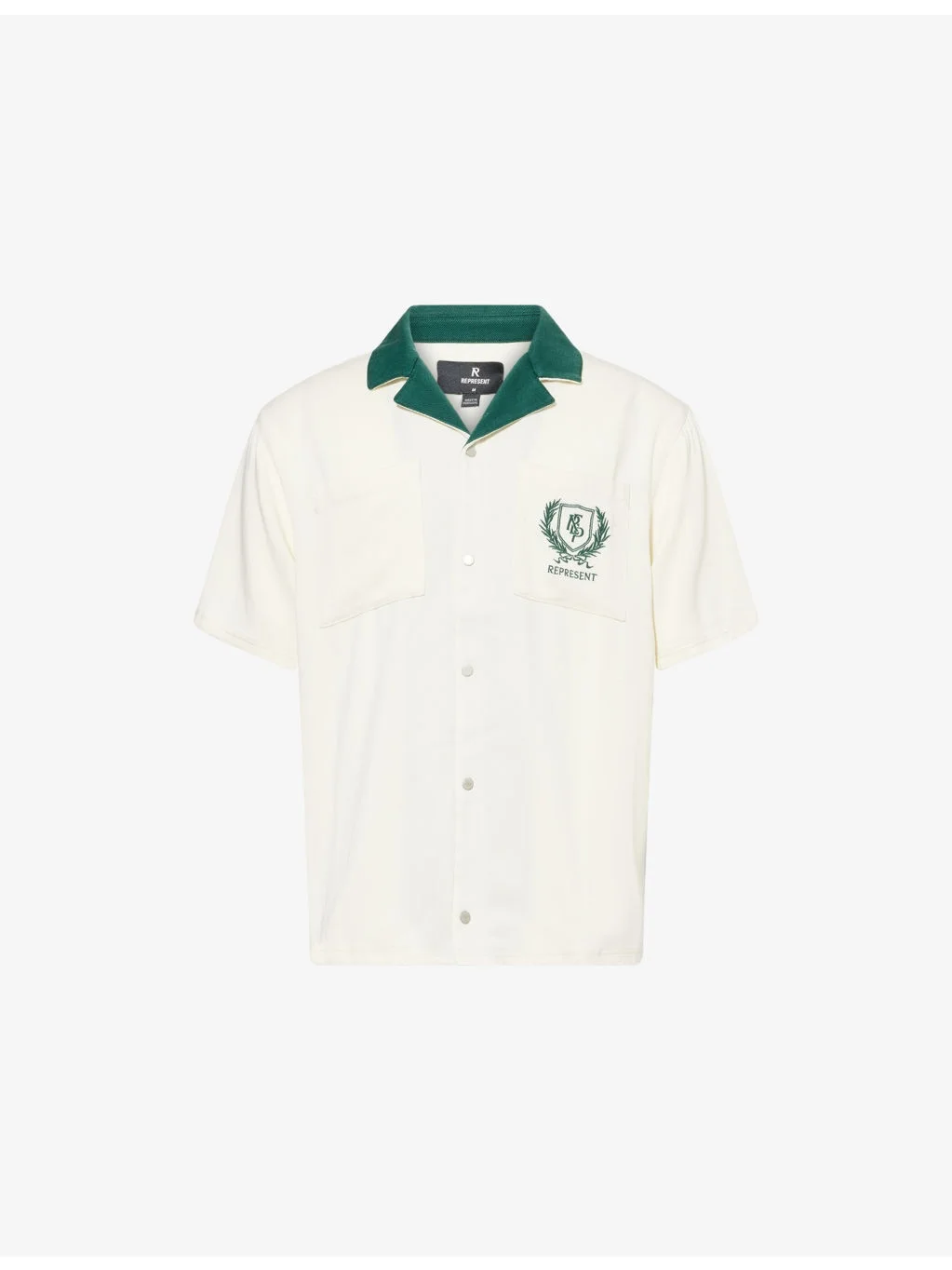 PRODUCT DETAILS - Represent woven shirt - 100% TENCEL™ - Pressed stud fastening at front - Camp collar - Closed cuffs - Relaxed fit, V-neck, contrast collar, short sleeves, two patch pockets and brand embroidery at front, brand and text embroidery at back, split at sides, all-over ribbed texture - Machine wash at 30°C - Made in Portugal - Size medium: length 28in / 72cm, chest 48in / 122cm - Model is 6ft 2in/1.88m and wears a size medium - Midweight, slight stretch Ref: R04460997