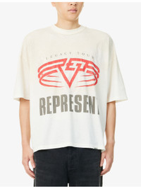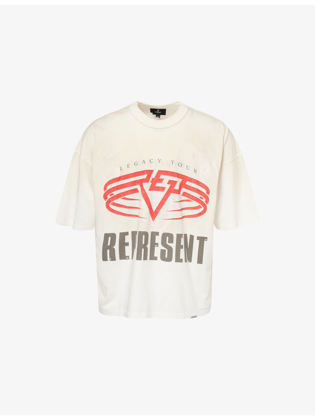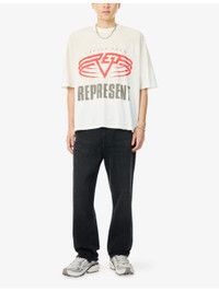 PRODUCT DETAILS - Represent cotton blend t-shirt - 85% cotton, 15% hemp - Crewneck, short sleeves, brand plaque at hem, all- over graphic print, distressed detailing, reversible - Machine wash at 30°C - Made in Portugal - Model is 6ft 2in/1.88m and wears a size medium - Lightweight, slight stretch Ref: R04523031