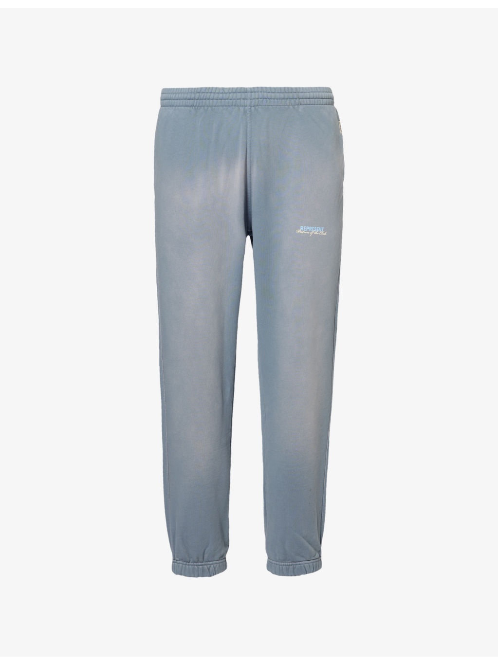 PRODUCT DETAILS - Represent cotton-jersey jogging bottoms - 100% cotton - Pulls on - Relaxed fit, mid-rise, straight leg, drawstring elasticated waistband, two slip pockets and brand plaque at front, brand print at front, two patch pockets at back, faded wash, elasticated cuffs - Machine wash at 30°C - Made in Portugal - Model is 6ft 2in/1.88m and wears a size medium - Midweight, stretchy Ref: R04400259