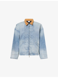 PRODUCT DETAILS - Rhude denim jacket - 100% cotton; lining 100% lyocell - Zip fastening - Regular fit, cord collar, long sleeves, buttoned sleeve hems, logo design at front, slip pockets at front, faded wash, lined - Dry clean only - Made in USA - Size medium: length 25in / 63.5cm, chest 52in / 132cm - Model is 6ft 2in/1.88m and wears a size medium - Midweight, non-stretch Ref: R04539414