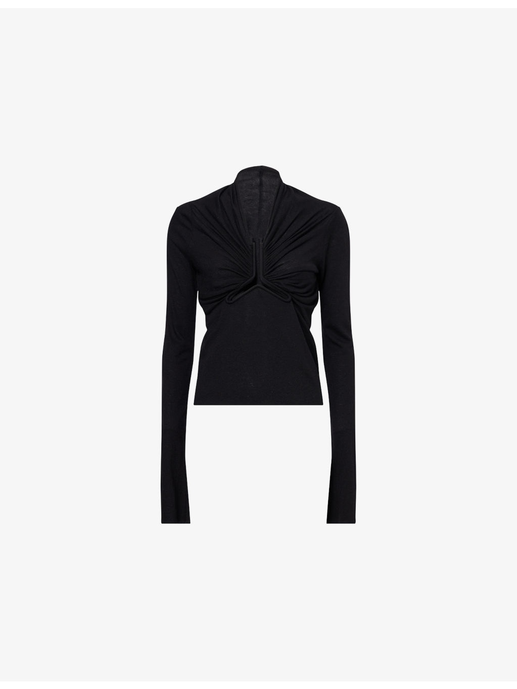 PRODUCT DETAILS - Rick Owens woven top - 40% wool, 30% viscose, 30% polyamide - Slim fit, V-neck, long sleeves, cut-out and geometric design underwire at front, ruched - Hand wash cold - Made in Italy - True to size - Model is 5ft 10in/1.78m and wears a size UK 8 - Lightweight, stretchy Ref: R04495597