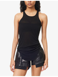 PRODUCT DETAILS - Rick Owens woven-blend top - 88% viscose, 12% silk - Slim fit, round-neck, sleeveless, all-over ribbed, curved raw hem - Hand wash cold - Made in Italy - True to size - Model is 5ft 10in/1.78m and wears a size UK 8 - Lightweight, stretchy Ref: R04495600