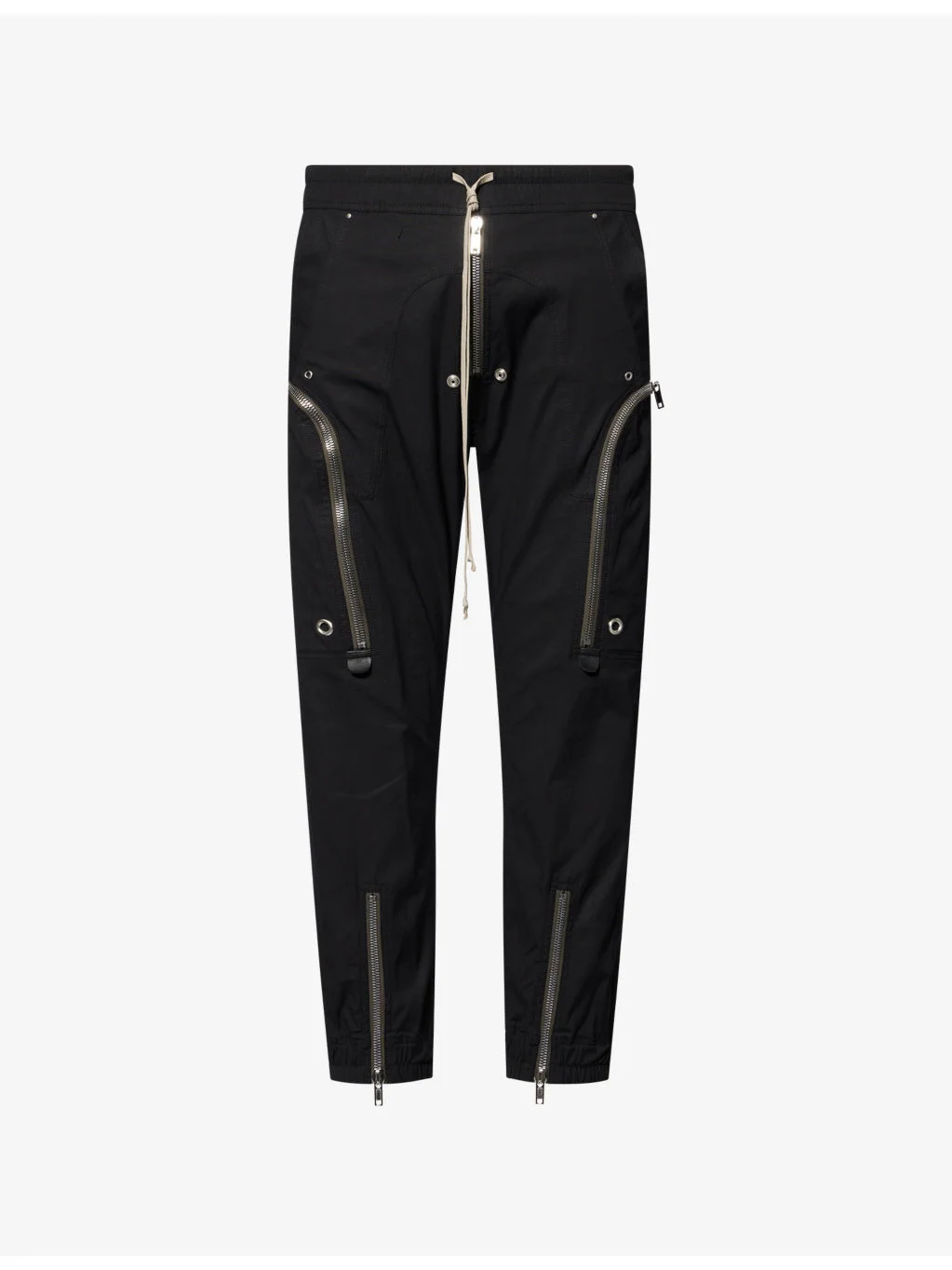 PRODUCT DETAILS - Rick Owens cotton-poplin cargo trousers - 97% cotton, 3% elastane - Slim fit, elasticated drawstring waistband, slim leg, two side slip pockets, two rounded zipped pockets at leg, two rear flap pockets, silver-toned hardware, eyelet embellishments, front shin splits with zips, elasticated cuffs, washed finish - Hand wash cold - Size UK 32: rise 12in / 30cm, inside leg 27in / 68.5cm, leg opening 10in / 25cm - Model is 6ft 2in/1.88m and wears a size UK 32 - Midweight, non-stretch Ref: R04557971