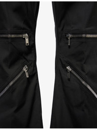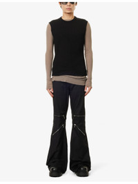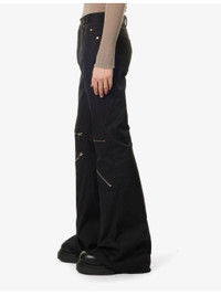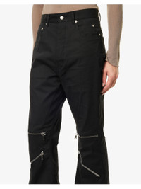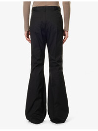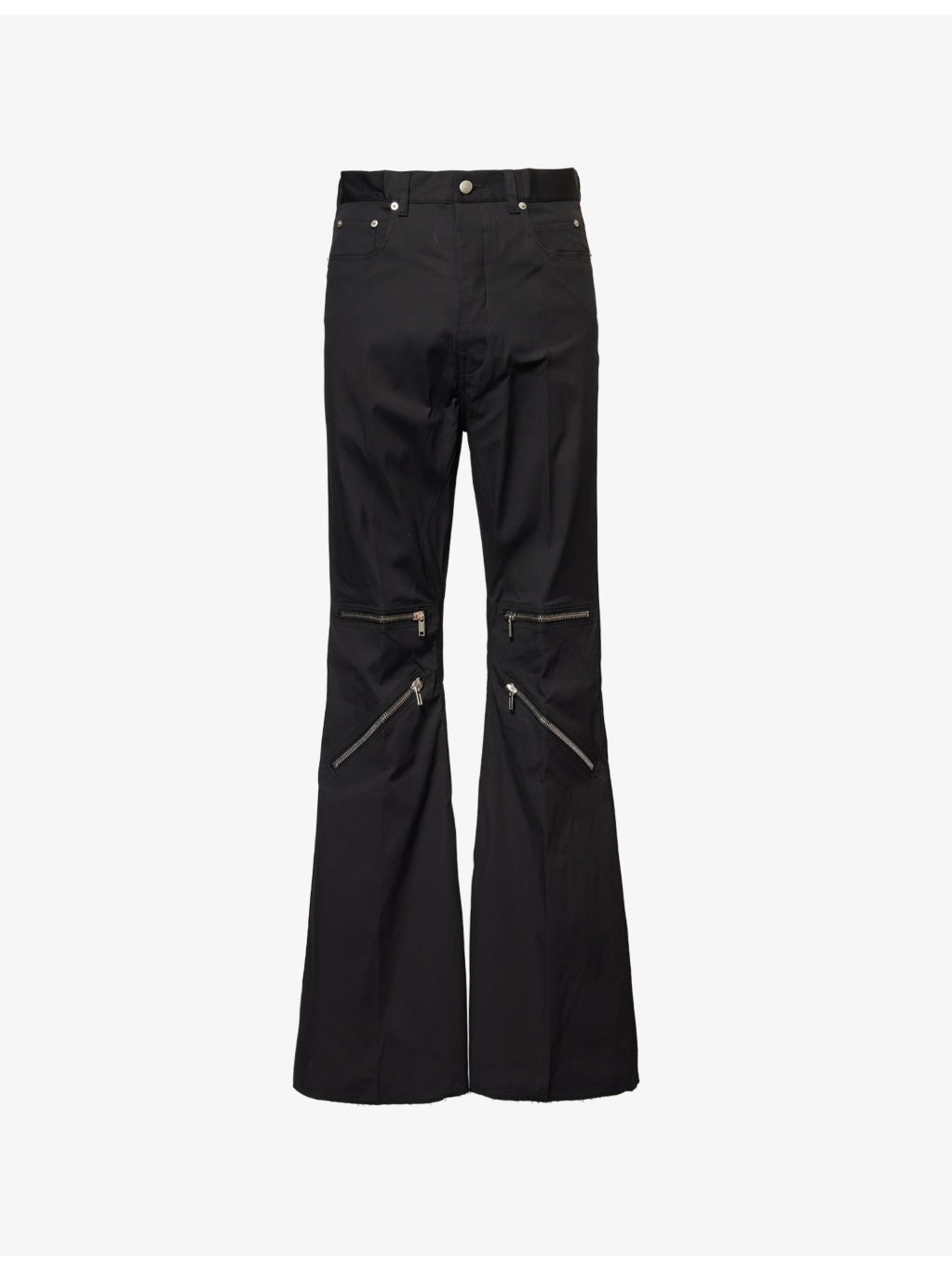PRODUCT DETAILS - Rick Owens stretch-cotton trousers - 97% cotton, 3% elastane - Exposed button and concealed button-fly fastening at front - Regular fit, mid-rise, flared leg, belt loops, classic five pockets, zipped pockets at front, raw cuffs - Specialist dry clean - Made in Italy - Size UK 30: rise 13.5in / 35cm, inside leg 37in / 94.5cm, leg opening 30in / 77cm - Model is 6ft 2in/1.88m and wears a size UK 30 - Midweight, slight stretch Ref: R04418170