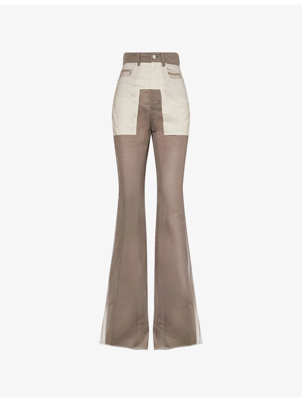 PRODUCT DETAILS - Rick Owens mesh trousers - 100% polyamide; lining 100% cotton - Button and zip-fly fastening - Regular fit, bootcut flare leg, mid-rise, belt loops, five pockets, sheer mesh over-layer, visible cotton lining - Hand wash - Made in Italy - True to size - Size 26: rise 14in / 35.5cm, inside leg 39in / 99cm, leg opening 26in / 66cm - Model is 5ft 10in/1.78m and wears a size 26 - Lightweight, non-stretch Ref: R04618955