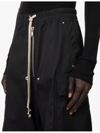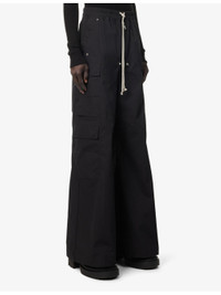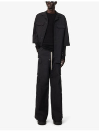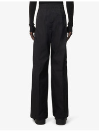 PRODUCT DETAILS - Rick Owens stretch-cotton trousers - 97% cotton, 3% elastane - Pulls on - Relaxed fit, high-rise, wide leg, drawstring elasticated waistband, zip fastening and two welt pockets at front, buttoned pockets at sides and back, flared cuffs - Hand wash cold - Made in Italy - Size UK 34: rise 17in / 43cm, inside leg 33in / 84cm, leg opening 32in / 82cm - Model is 6ft 2in/1.88m and wears a size UK 34 - Lightweight, non-stretch Ref: R04418188