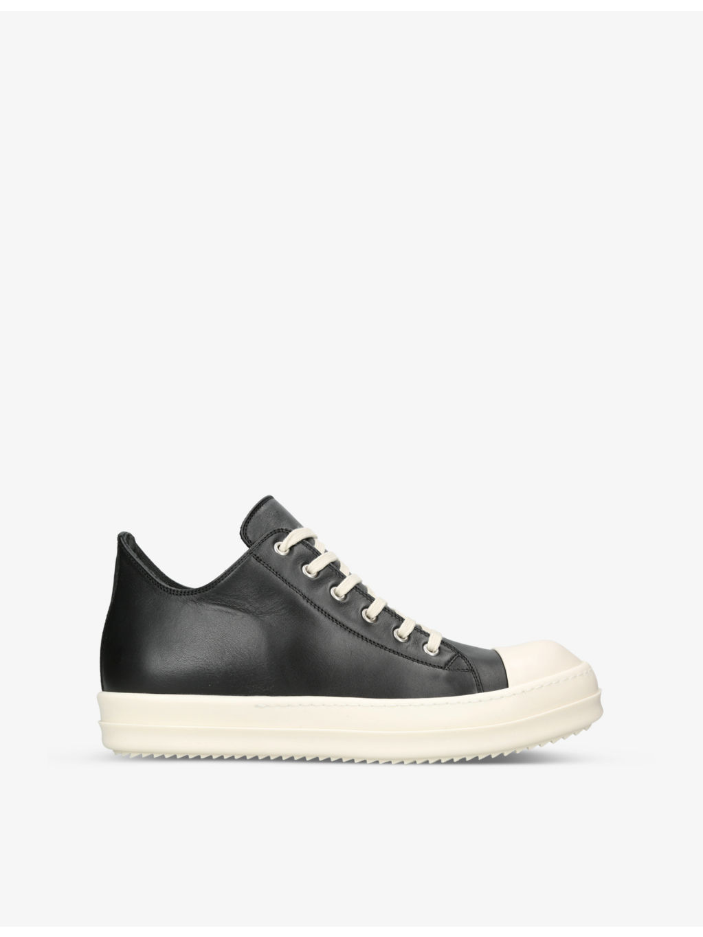 PRODUCT DETAILS - Rick Owens leather low-top trainers - 100% leather; trims 100% waxed cotton - Lace-up fastening - Round closed toe, toe cap, low-top silhouette, chunky contrast sole, ridged edge - Specialist leather clean - Made in Italy - Upper: 100% leather; trims 100% waxed cotton - Lining: 100% leather - Sole: 100% rubber Ref: R03953898