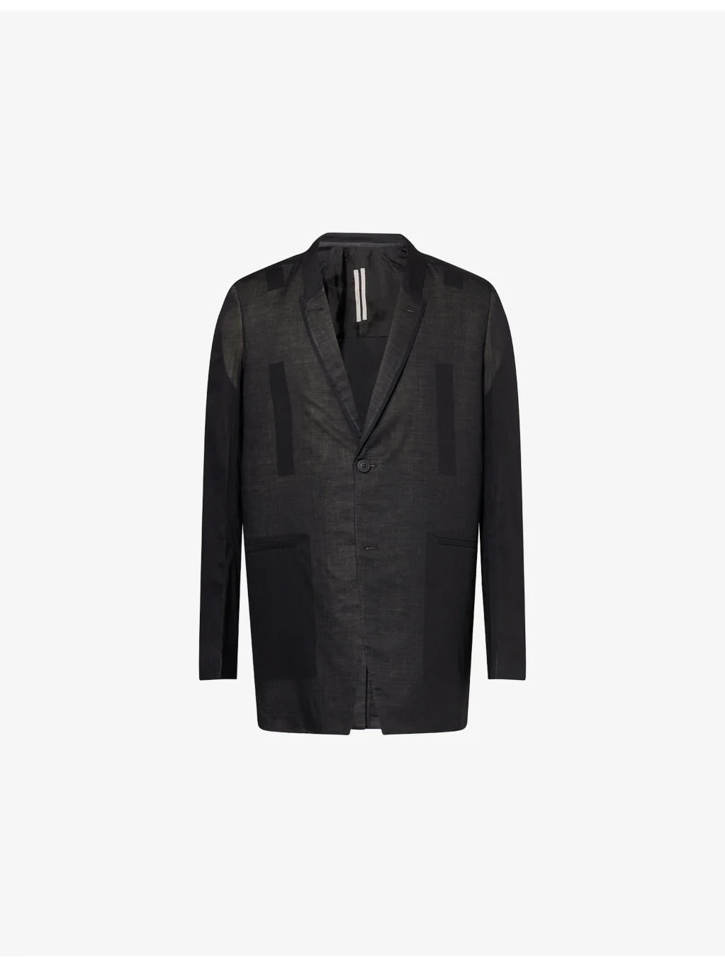 PRODUCT DETAILS - Rick Owens cotton jacket - 100% cotton; lining 100% cupro - Button fastening - Relaxed fit, notched lapels, long sleeves, padded shoulders, buttoned cuffs, slip pockets at front and interior, semi-sheer outer layer, vent at back, fully lined - Hand wash - Made in Italy - Size UK 40: chest 44in / 112cm, length 34in / 86.5cm - Model is 6ft 2in/1.88m and wears a size UK 40 - Midweight, non-stretch Ref: R04557988