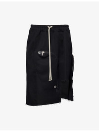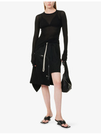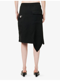 PRODUCT DETAILS - Rick Owens wool midi skirt - 100% wool; buttons 100% buffalo horn; embellishments 100% cow leather - Regular fit, high-waist, drawstring elasticated waistband, two slip pockets and zip pocket at front, buttoned pocket and zip pocket at back, raw asymmetric hem - Dry clean - Made in Italy - True to size - Size UK 8: length 30in / 77cm - Model is 5ft 10in/1.78m and wears a size UK 8 - Midweight, slight stretch Ref: R04495608