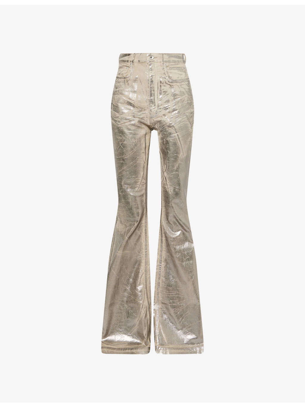 PRODUCT DETAILS - Rick Owens DRKSHDW cotton-blend trousers - 90% cotton, 7% polyester, 3% rubber - Button and zip-fly fastening - Regular fit, high rise, bootcut leg, structured waistband with belt loops, five pockets, metallic finish - Dry clean - Made in Italy - True to size - Size 26: rise 13in / 33cm, inside leg 37in / 94cm, leg opening 24in / 61cm - Model is 5ft 10in/1.78m and wears a size 26 - Lightweight, stretchy Ref: R04537776