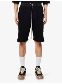 PRODUCT DETAILS - Rick Owens DRKSHDW cotton-jersey shorts - 100% cotton; contrast 97% cotton, 3% elastane - Relaxed fit, high-rise, contrast drawstring elasticated waistband, two slip pockets at front, hook-and-loop tape pockets at back, popper fastening at sides, brushed interior - Hand wash cold - Made in Italy - Model is 6ft 2in/1.88m and wears a size medium - Midweight, stretchy Ref: R04507265