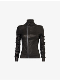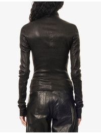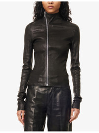 PRODUCT DETAILS - Rick Owens stretch-leather blend jacket - 65% lamb leather, 34% cotton, 1% elastane - Exposed zip fastening at front - Slim fit, high-neck, long sleeves, all-over grained leather, raw trims - Wipe with a clean, dry cloth - Made in Italy - True to size - Size UK 8: length 21in / 54cm - Model is 5ft 10in/1.78m and wears a size UK 8 - Lightweight, stretchy Ref: R04495626