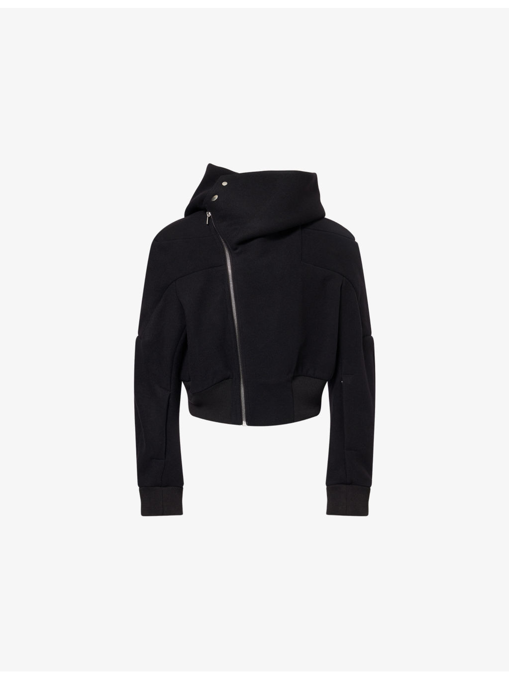 PRODUCT DETAILS - Rick Owens wool jacket - 100% wool - Zip fastening at front - Fixed hood with asymmetric flip-down collar, long sleeves, ribbed cuffs, two slip-zipped pockets at sleeves, ribbed trims - Dry clean - Made in Italy - Size UK 40: length 25.9in / 66cm, chest 51.1in / 131cm - Model is 6ft 2in/1.88m and wears a size UK 40 - Midweight, non-stretch Ref: R04490417