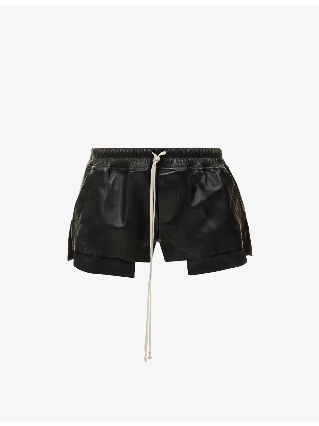 PRODUCT DETAILS - Rick Owens leather shorts - 100% leather - Regular fit, low-rise, drawstring elasticated waistband, side slip pockets - Specialist leather clean - True to size - Size UK 8: rise 9in / 23cm, inside leg 2in / 5.5cm, leg opening 16in / 41cm - Model is 5ft 10in/1.78m and wears a size UK 8 - Midweight, non-stretch Ref: R04583827