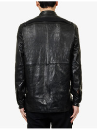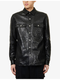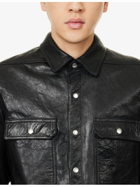 PRODUCT DETAILS - Rick Owens leather shirt - 100% leather - Snap fastening at front - Oversized fit, classic collar, long sleeves, buttoned cuffs, flap pockets at chest, tab at back - Specialist leather clean - Size UK 38: length 29.5in / 75cm, chest 43in / 110cm - Model is 6ft 2in/1.88m and wears a size UK 38 - Heavyweight, non-stretch Ref: R04557990