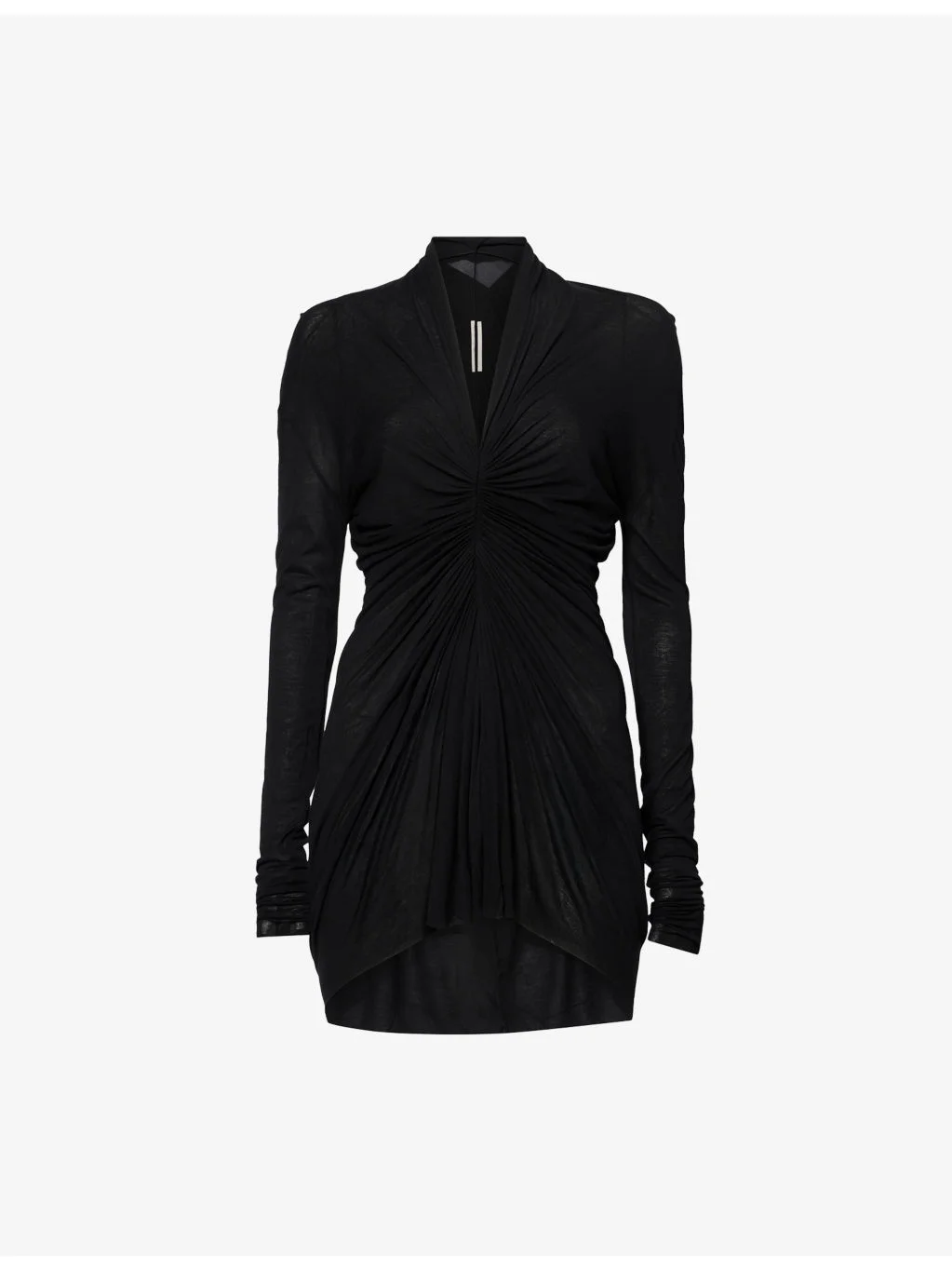 PRODUCT DETAILS - Rick Owens woven top - 88% viscose, 12% silk - Slim fit, V-neck, long sleeves, gathered at front, raw trims - Hand wash cold - Made in Italy - Model is 5ft 10in/1.78m and wears a size UK 8 - Lightweight, stretchy Ref: R04583818