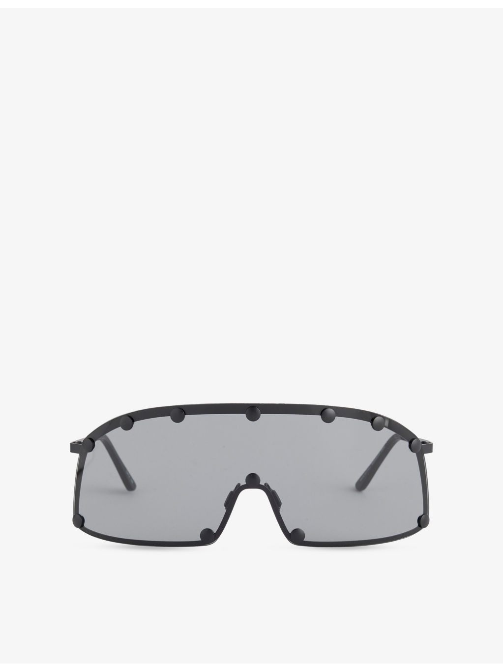 PRODUCT DETAILS - Rick Owens stainless steel sunglasses - Frame 100% stainless steel; lenses 100% nylon - Curved - 100% UV protection, black lenses, studded frame, nose pads, thin temples, internal brand print - Lens width 75mm, bridge size 15mm, temple length 125mm - Wipe with a clean, dry cloth - Made in Italy - Comes with hard case and cloth, presented in a box Ref: R04509312