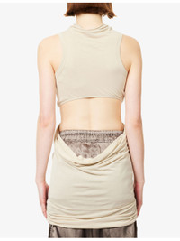 PRODUCT DETAILS - Rick Owens jersey top - 88% viscose, 12% silk - Regular fit, v-neck, sleeveless, fitted top, draped construction at waist, cut-out at back, all-over ruching - Hand wash - Made in Italy - True to size - Model is 5ft 10in/1.78m and wears a size UK 8 - Lightweight, stretchy Ref: R04583808