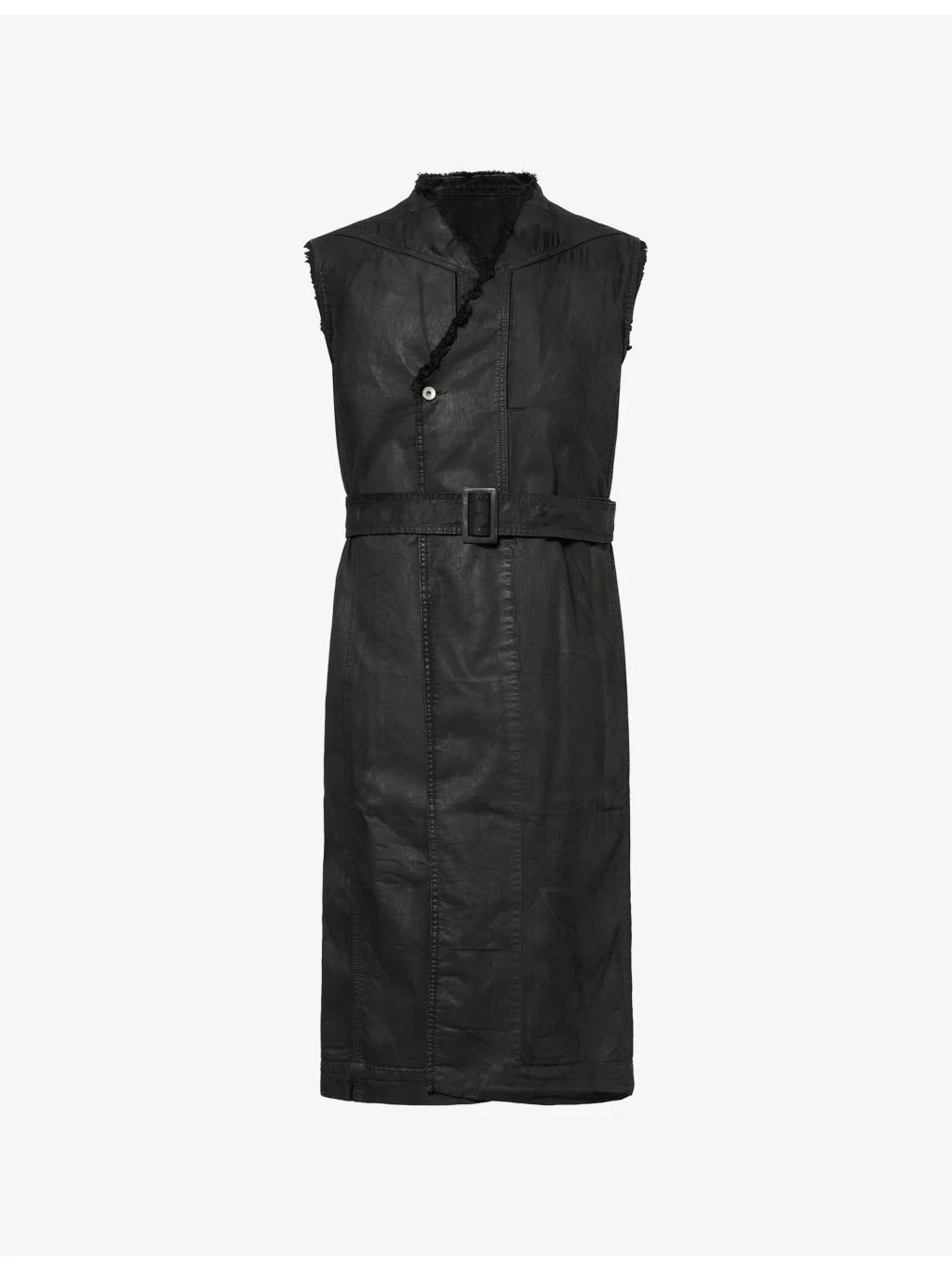 PRODUCT DETAILS - Rick Owens coated-cotton coat - 100% cotton - Button fastening - Regular fit, double breasted, sleeveless, v-neck, raw edge hem at neckline and armholes, adjustable belt at waist, slip pockets at front, vent at back - Dry clean - Made in Italy - Size UK 40: chest 44in / 112cm, length 47.5in / 121cm - Model is 6ft 2in/1.88m and wears a size UK 40 - Midweight, non-stretch Ref: R04608261