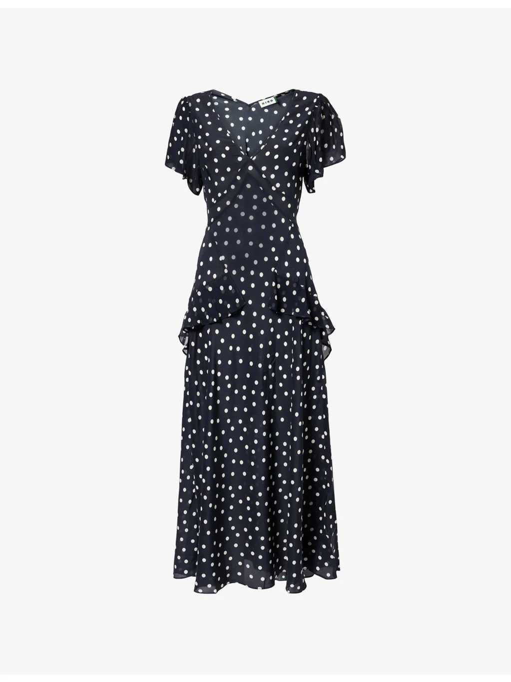 PRODUCT DETAILS - Rixo silk midi dress - 100% silk - Slim fit, V-neckline, short flutter sleeves, self-tie belt at fitted waist, frill peplum at hip, unlined - Dry clean - True to size - Size UK 8: length 53in / 134.5cm - Model is 5ft 10in/1.78m and wears a size UK 8 - Lightweight, non-stretch Ref: R04531315