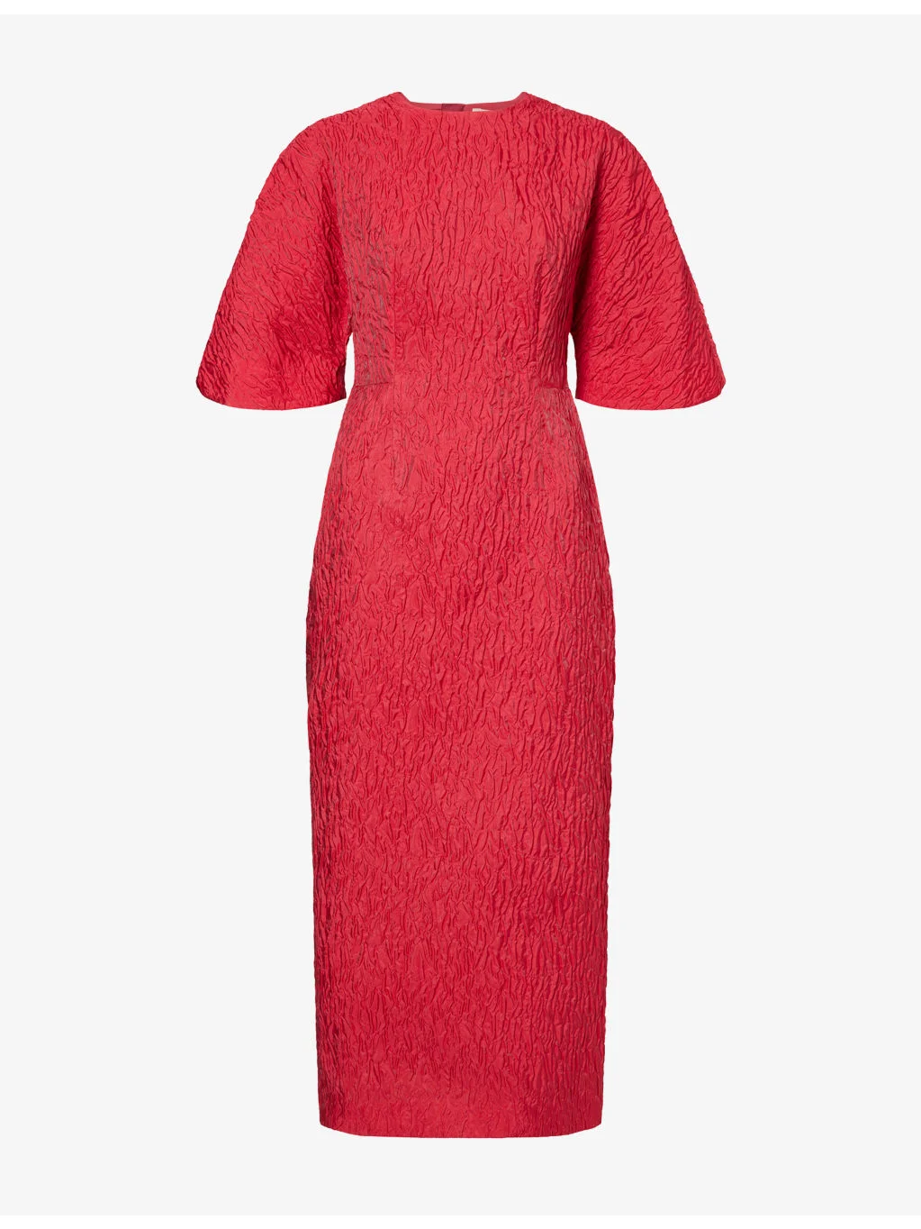 PRODUCT DETAILS - Roksanda satin midi cress - 76% polyester, 24% polyamide; lining 73% acetate, 27% silk - Concealed zip fastening at back - Regular fit, round neck, short flared sleeves, cinched waist, vent at back, all-over crinkle-effect, fully lined - Dry clean - True to size - Size UK 8: length 51in / 130cm - Model is 5ft 11in/1.80m and wears a size UK 8 - Midweight, non-stretch Ref: R04579986
