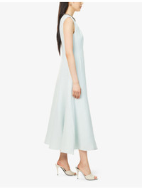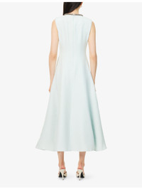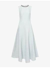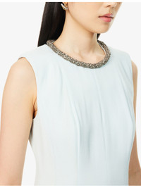 PRODUCT DETAILS - Roland Mouret wool and silk midi dress - 62% wool, 38% silk; lining 100% polyester - Concealed zip fastening at side - Regular fit, rhinestone embellished round-neck, padded shoulders, sleeveless, two slip pockets at front, darts at front and back, fully lined, flared hem - Dry clean - True to size - Size UK 8: length 52in / 132cm - Model is 5ft 10in/1.78m and wears a size UK 8 - Midweight, slight stretch Ref: R04485553