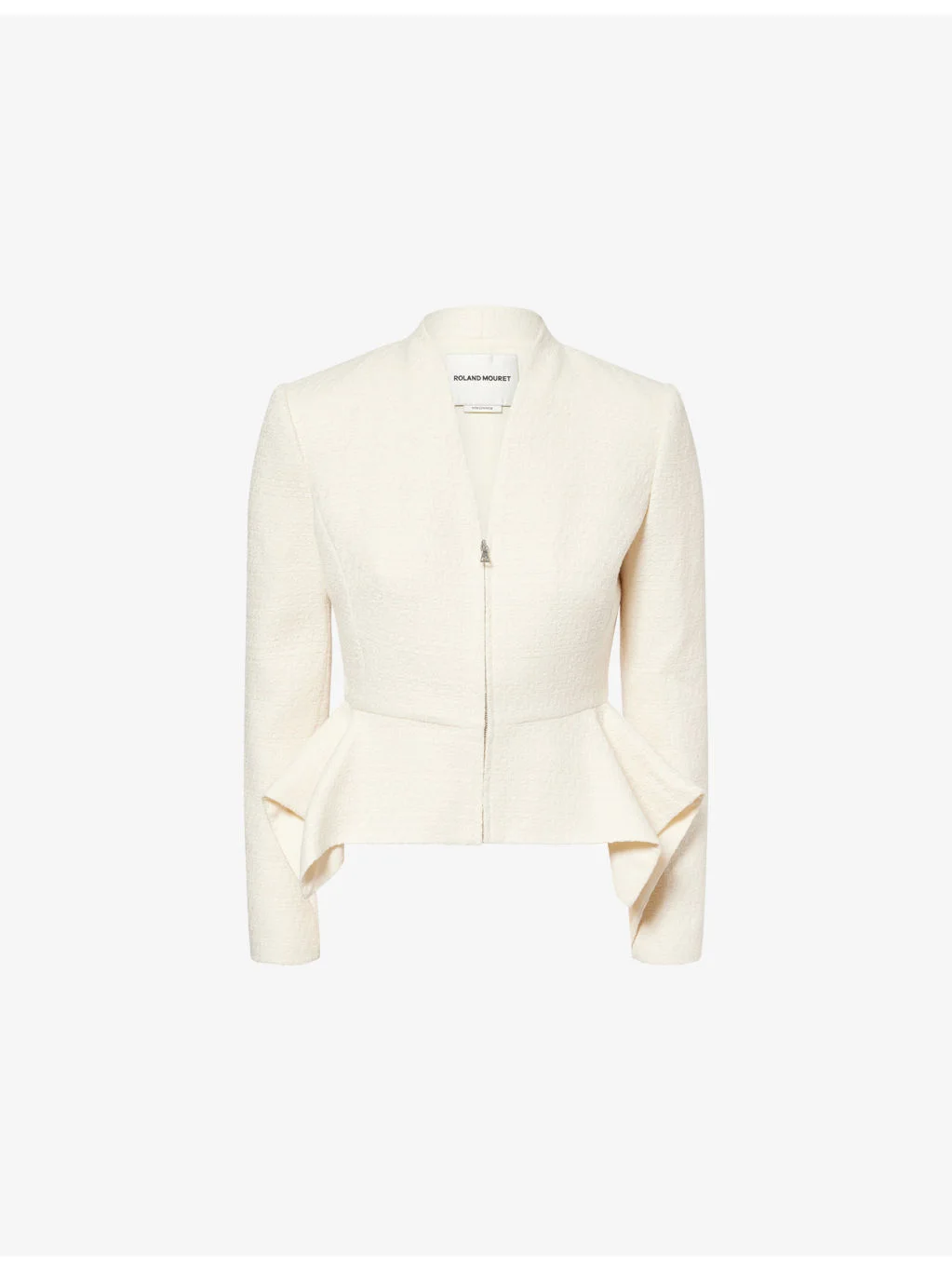 PRODUCT DETAILS - Roland Mouret boucle jacket - 57% polyester, 43% acrylic - Zip fastening - Close fit, V-neck, long sleeves, flared asymmetric hem panel, fully lined - Dry clean - True to size - Size 8: length 24in / 60.9cm - Model is 5ft 10in/1.78m and wears a size UK 8 - Midweight, non-stretch Ref: R04603744