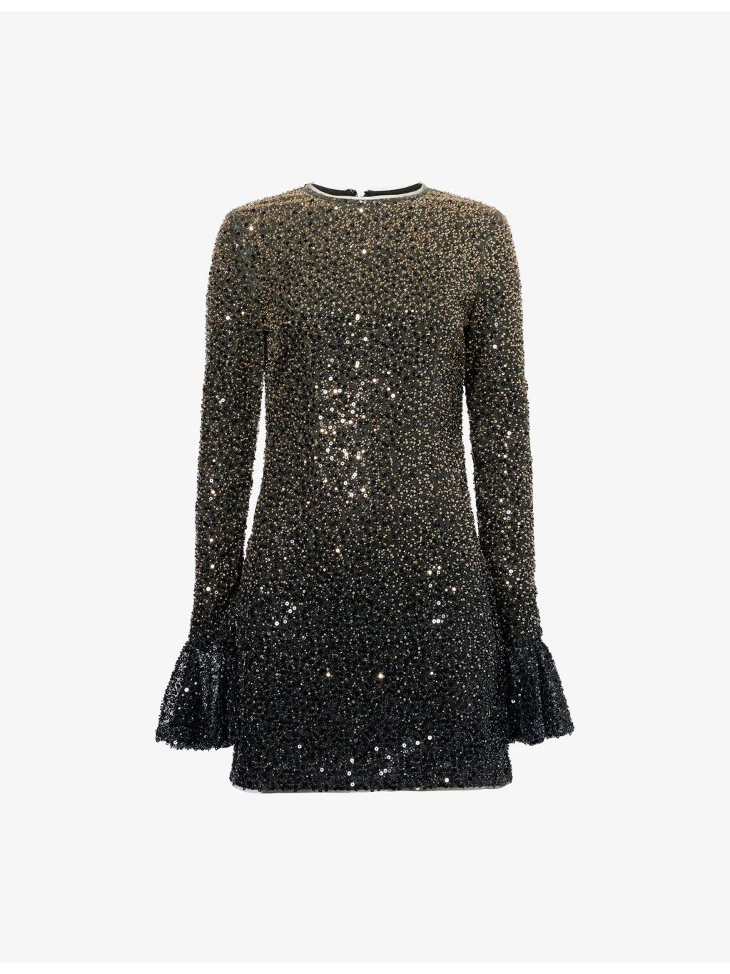 PRODUCT DETAILS - ROTATE Birger Christensen woven mini dress - 100% polyester; embellishments 100% polyester; lining 95% polyester, 5% elastane - Concealed zip fastening at back - Slim fit, round-neck, long sleeves, ruffled cuffs, all-over bead and sequin embellishment, all-over mesh texture, fully lined, flared hem - Dry clean - True to size - Size UK 8: length 32in / 82cm - Model is 5ft 10in/1.78m and wears a size UK 8 - Midweight, stretchy Ref: R04549205