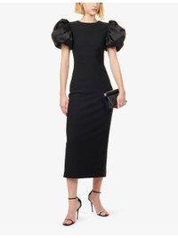 Draped Puffed-Sleeves Stretch-Woven Midi Dress