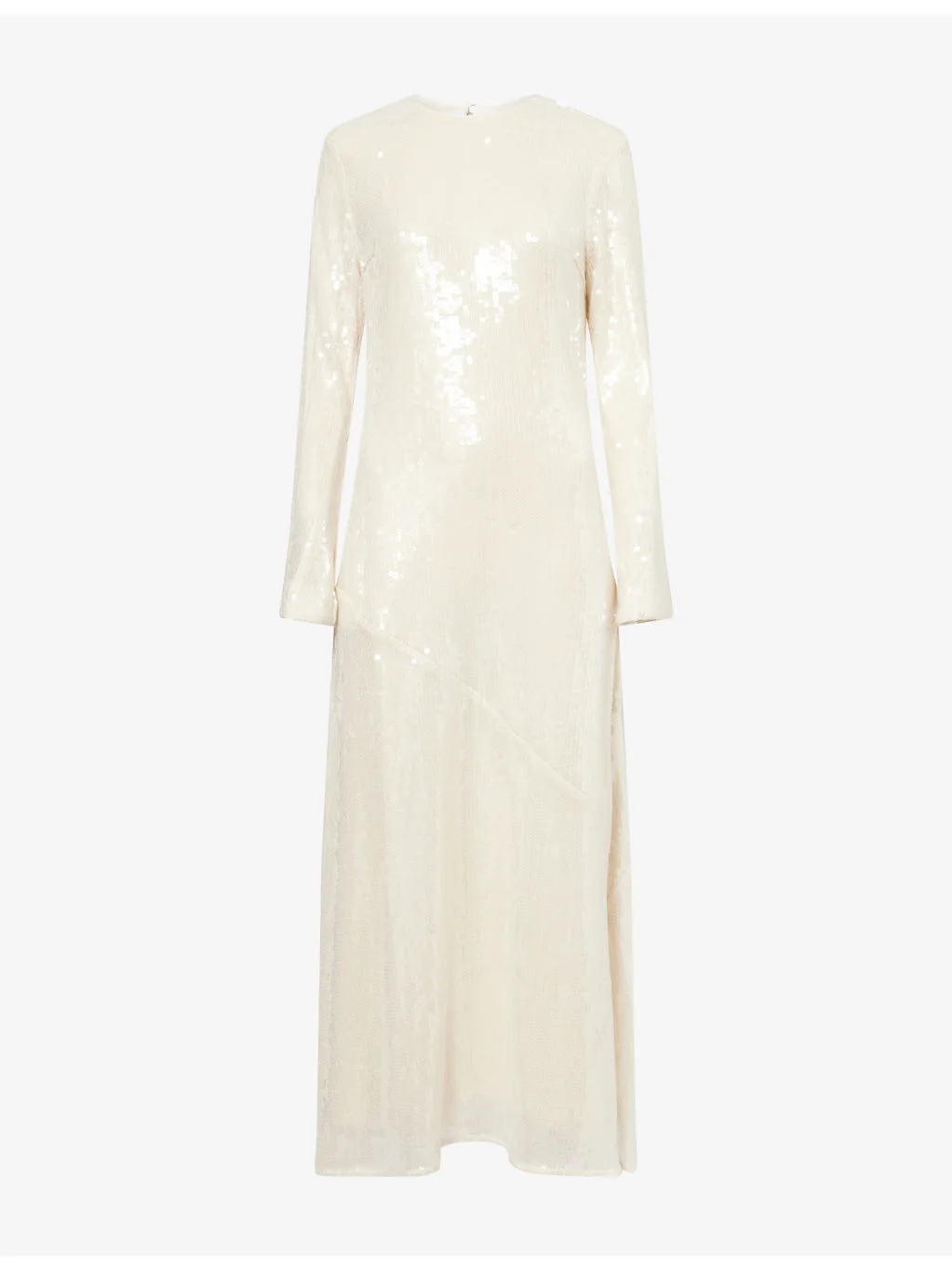 PRODUCT DETAILS - ROTATE Birger Christensen sequin-embellished maxi dress - 95% polyester, 5% elastane; contrast 100% polyester; lining 95% polyester, 5% elastane - Concealed zip fastening at back - Regular fit, round neck, long sleeves, flared cuffs, asymmetrical seam, all-over sequin embellishments, ankle length - Dry clean - True to size - Size UK 8: length 56in / 142cm - Model is 5ft 10in/1.78m and wears a size UK 8 - Lightweight, non-stretch Ref: R04483733