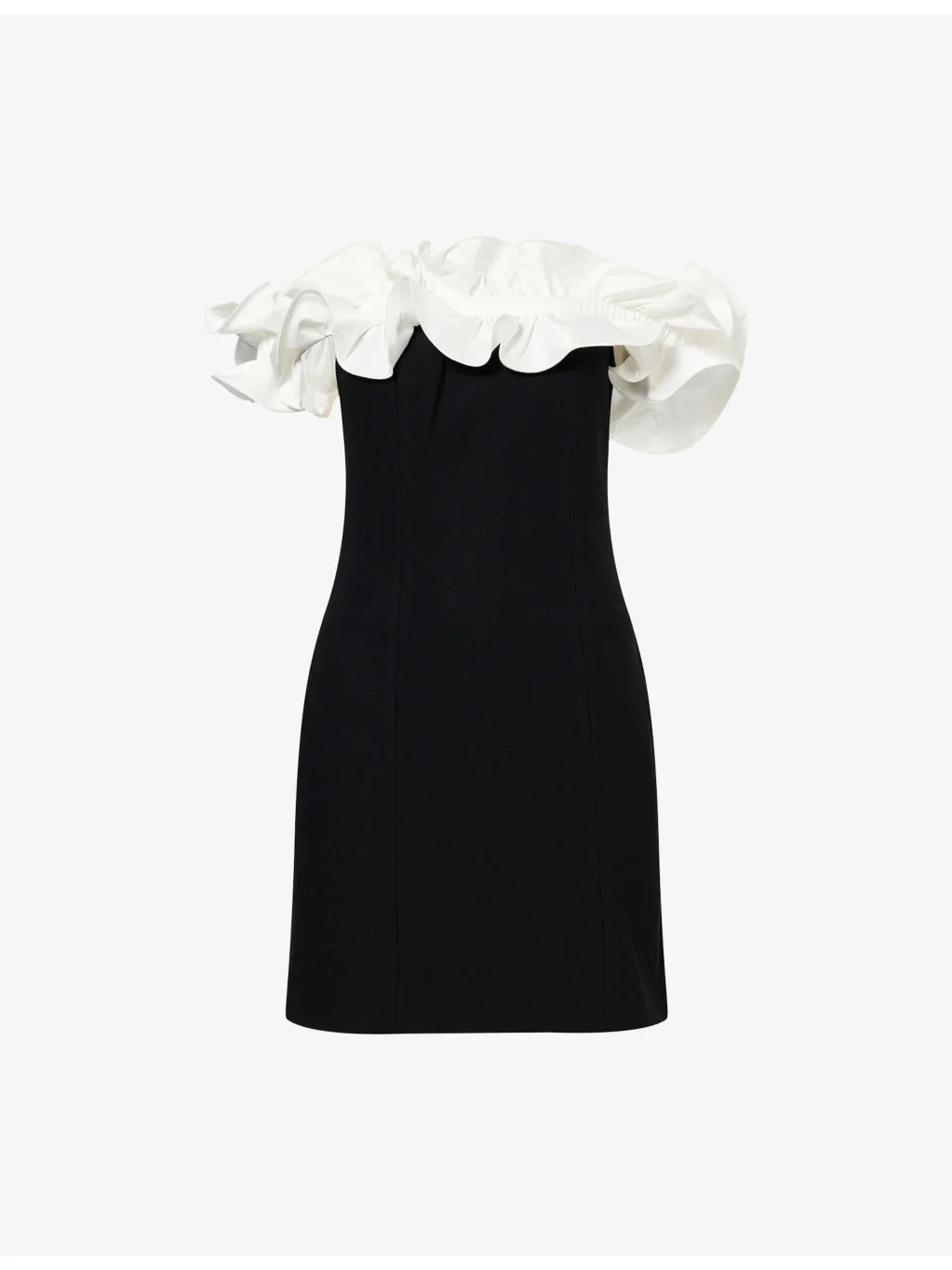 PRODUCT DETAILS - ROTATE Birger Christensen woven mini dress - 95% polyester, 5% elastane; embellishments 100% polyester - Concealed zip fastening at back - Slim fit, off-shoulders, contrast satin ruffled elasticated neckline, darts at front and back, all-over crepe texture, fully lined - Hand wash cold - True to size - Size UK 8: length 26in / 66cm - Model is 5ft 10in/1.78m and wears a size UK 8 - Midweight, stretchy Ref: R04549202