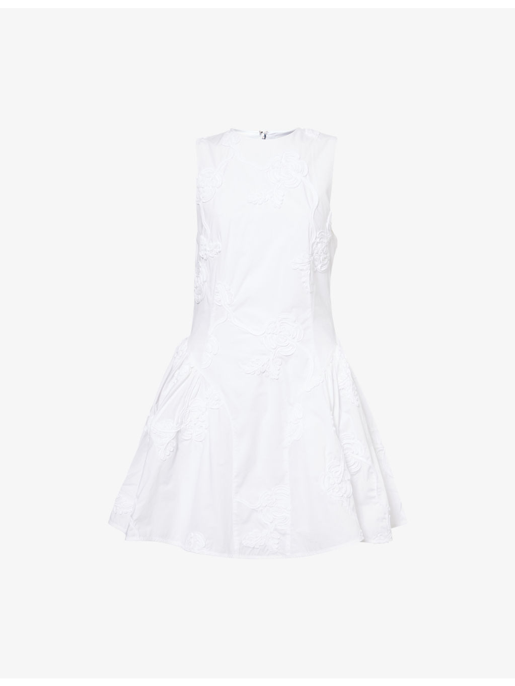 PRODUCT DETAILS - ROTATE Birger Christensen cotton-poplin mini dress - 100% cotton; lining 97% viscose, 3% elastane; trims 100% polyester - Concealed zip fastening at back - Regular fit, round neck, sleeveless, drop waist, flared skirt, silver-toned branded zip, all-over floral applique, mini length, fully lined - Dry clean - True to size - Size UK 8: length 35.5in / 90cm - Model is 5ft 10in/1.78m and wears a size UK 8 - Lightweight, non-stretch Ref: R04483737