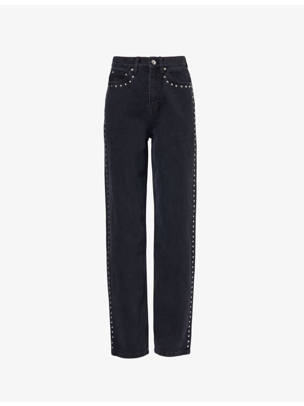 PRODUCT DETAILS - ROTATE Birger Christensen denim jeans - 100% cotton - Exposed button and concealed zip-fly fastening at front - Regular fit, high rise, straight leg, structured waistband with belt loops, five pockets, brand patch at back waistband, logo plaque at back, all-over stud embellishments silver-toned branded hardware, - Hand wash - Made in Turkey - True to size - Size 26: rise 12in / 30cm, inside leg 32in / 82cm, leg opening 14in / 36cm - Model is 5ft 10in/1.78m and wears a size 26 - Midweight, non-stretch Ref: R04406167