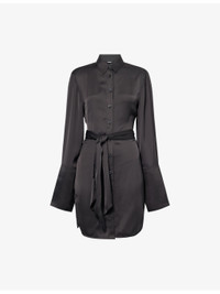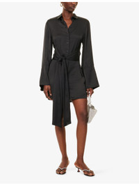 PRODUCT DETAILS - ROTATE Birger Christensen woven mini dress - 100% polyester - Exposed button fastening at front - Relaxed fit, spread collar, detachable padding at shoulders, wide long sleeves, buttoned cuffs, straight yoke at back, self-tie fastening at waist, all-over satin texture, curved hem - Hand wash cold - True to size - Size UK 8: length 30in / 77cm - Model is 5ft 10in/1.78m and wears a size UK 8 - Lightweight, non-stretch Ref: R04483743