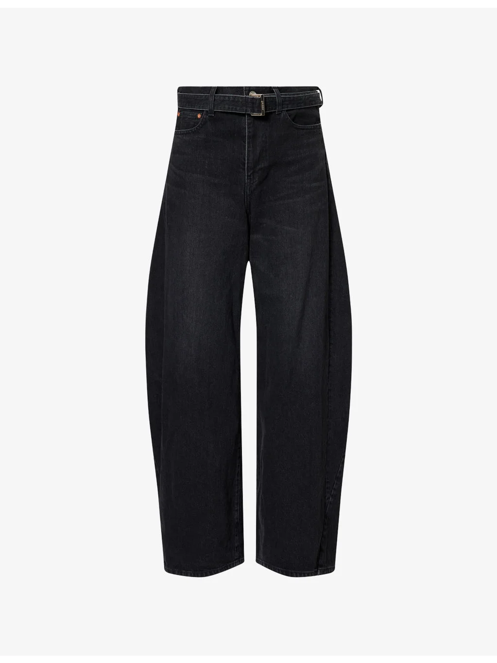 PRODUCT DETAILS - Sacai denim jeans - 100% cotton - Button and zip-fly fastening - High rise, wide barrel-leg, five pockets, belt loops, removable adjustable belt, branded hardware, patch pocket at leg - Dry clean - Made in Japan - True to size - Size small: rise 13in / 33cm, inside leg 32in / 81.5cm, leg opening 22in / 56cm - Model is 5ft 10in/1.78m and wears a size small - Midweight, non-stretch Ref: R04567710